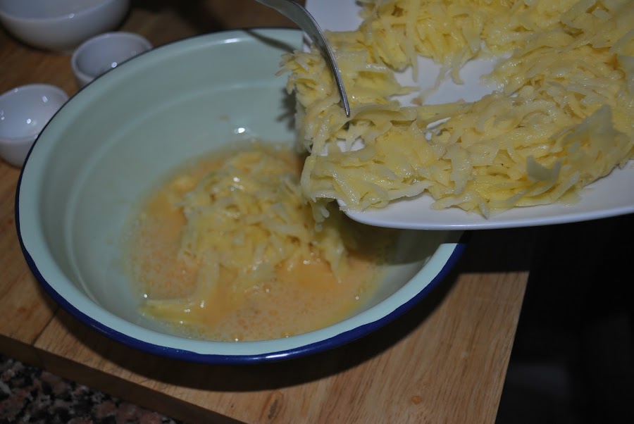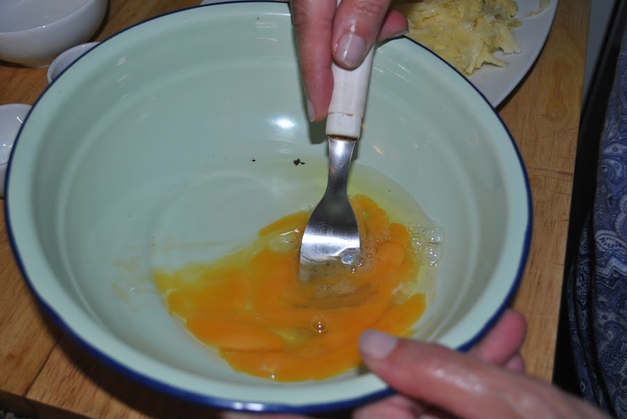 Ahora vamos añadiendo la patata poco a poco. Debe quedar como una pasta , sin miedo a que parezca dura. Imaginaos la proporción, un huevo para 4 patatas medianas.
