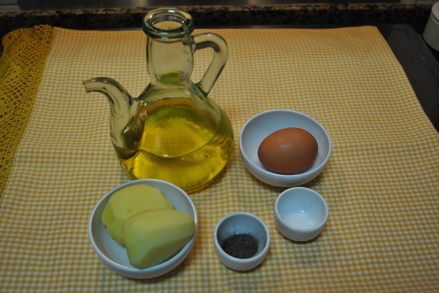Calentamos una sartén con aceite de oliva y la mantenemos a fuego lento. La patata está cruda y si la ponemos a fuego vivo se nos pueden quemar por fuera y quedar duras por dentro.