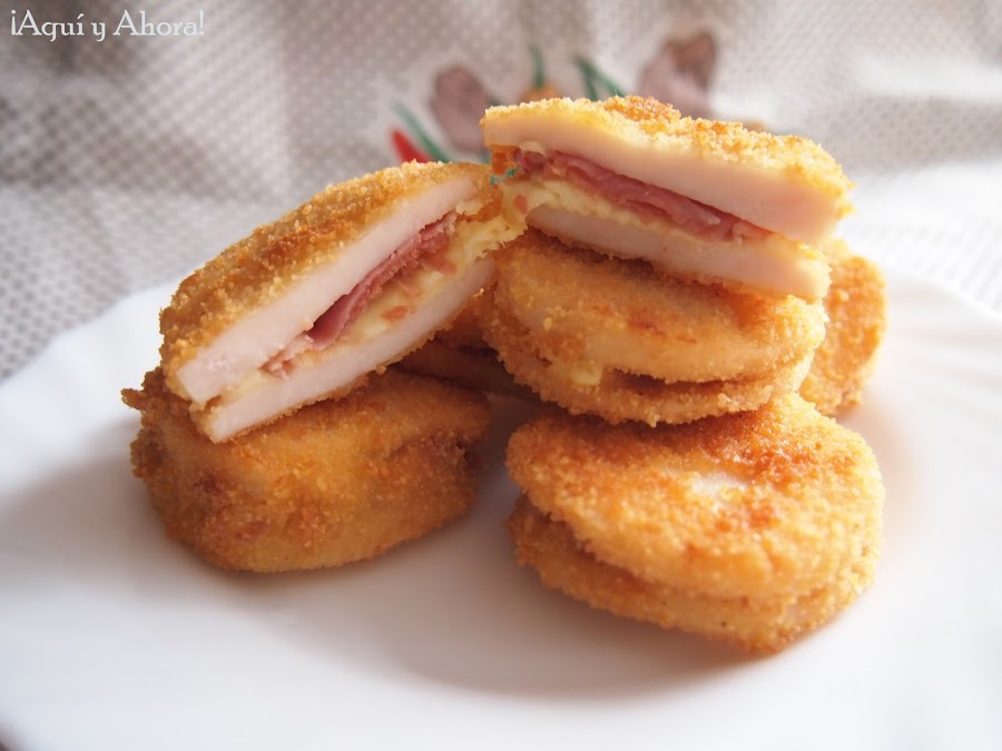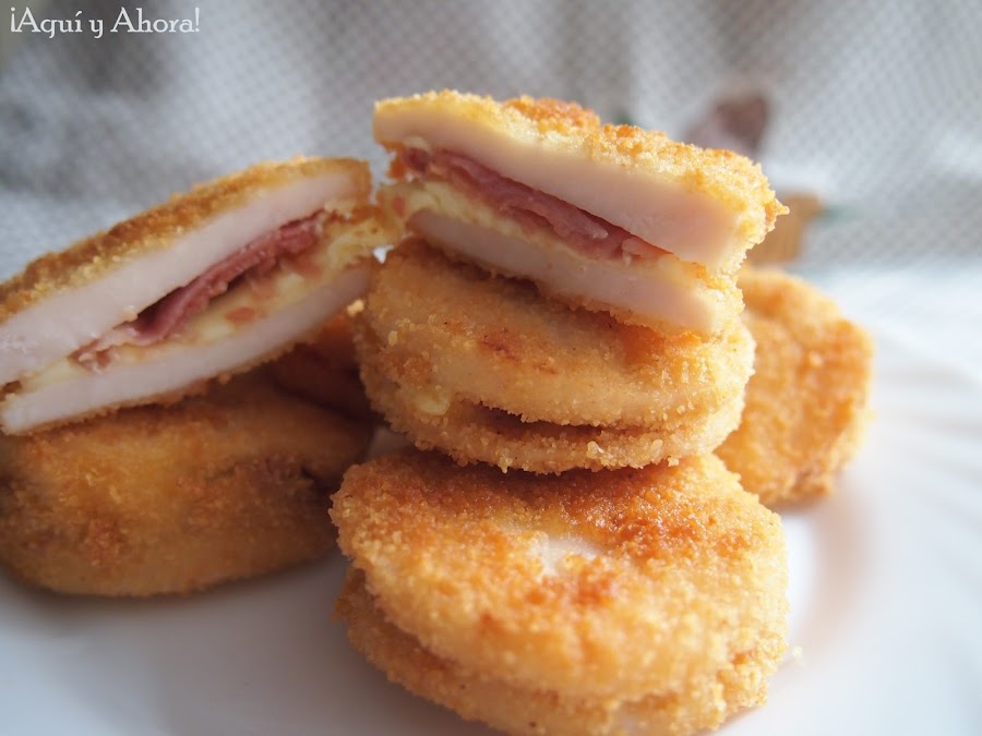 Elaboración:Cortamos en rodajas la pechuga de pollo para hacer los bocaditos. Cortamos las lonchas de queso en cruz y utilizaremos cada trozo para su relleno. Las lonchas de jamón serrano las cortaremos en tres partes.