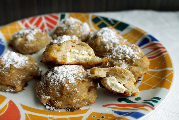En una bandeja de horno con papel vegetal se van haciendo los bocados, con ayuda de dos cucharas se extiende un círculo de masa, más o menos de 10 centímetros de diámetro, procurando no tocarlo con las manos porque es muy pegajoso. En medio se pone un poco de queso de untar, el tamaño de media nuez, ahora con la ayuda de las cucharas se van levantando los bordes de la masa y se va cubriendo el queso, hasta tapar por completo el relleno y dejar una bolita.