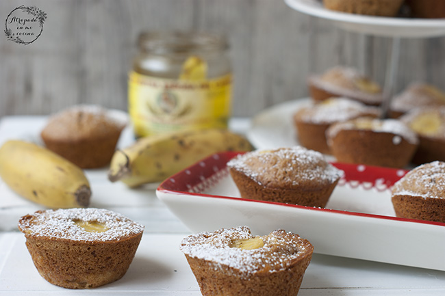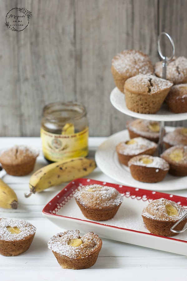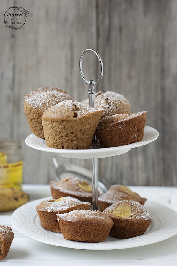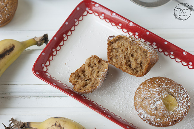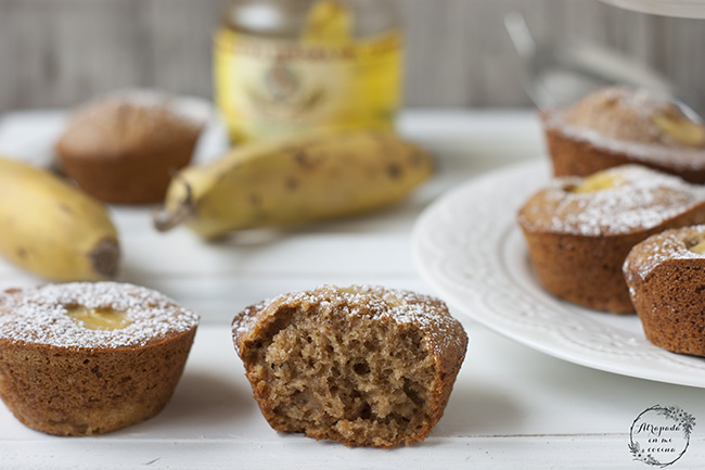 Engrasamos doce moldes (yo con spray desmoldante), yo los he horneado en un molde para magdalenas, aunque da para más si los hacemos de este tamaño, el resto de la masa la he horneado en moldes para flanes, por lo que con las medidas que os he puesto me han salido doce horneadas en moldes multicavidades para magdalenas y tres en flaneras, más grandecitos. Rellenamos la masa hasta un tercio del molde. Ponemos una rodajita de plátano encima y horneamos durante unos 25 minutos o hasta comprobar que al pinchar con una brocheta ésta sale limpia. Sacamos y dejamos enfriar. Desmoldamos y espolvoreamos con azúcar glass y servimos en seguida.
