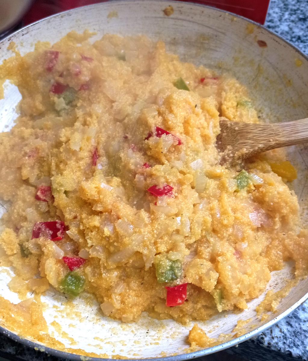 Agregar la polenta en forma de lluvia revolviendo constantemente, y cocinar un minuto y apartar, añadir la manteca, mezclar bien, y volcar en una fuente aceitada de forma que quede rectangular y de 2 cm de alto.