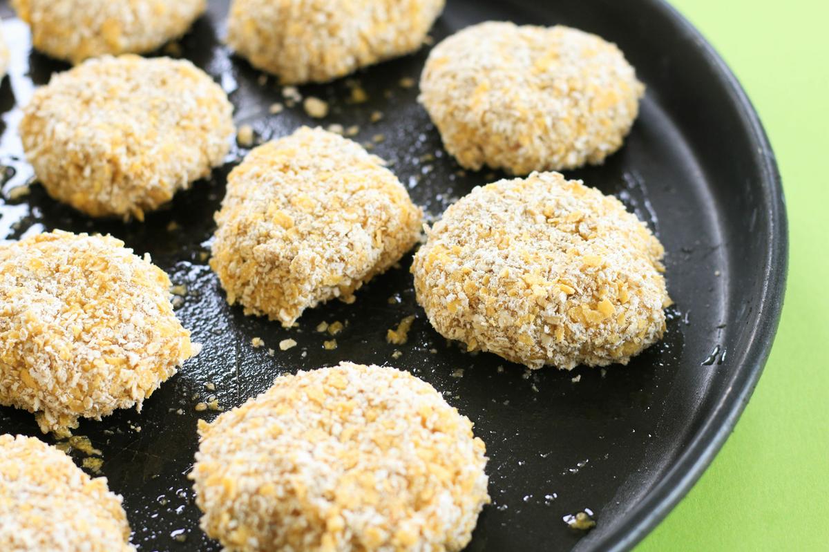 Formar los bocaditos, pasarlos por la avena, después por el huevo y, por último, nuevamente por avena.