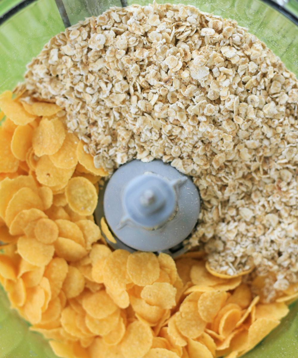 Por otro lado, procesar la avena junto con los copos de maíz hasta que los copos estén bien triturados.