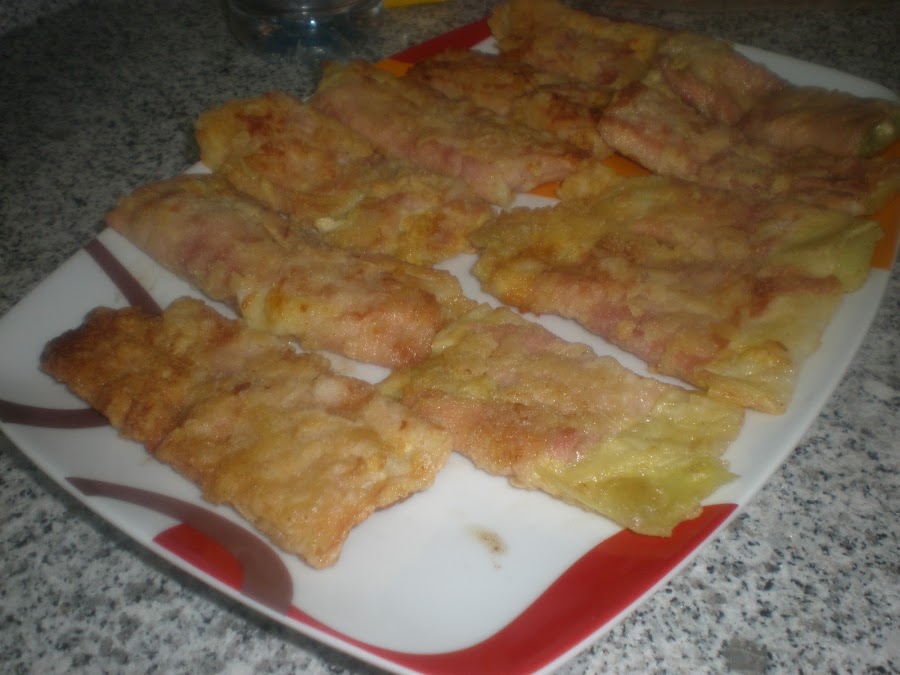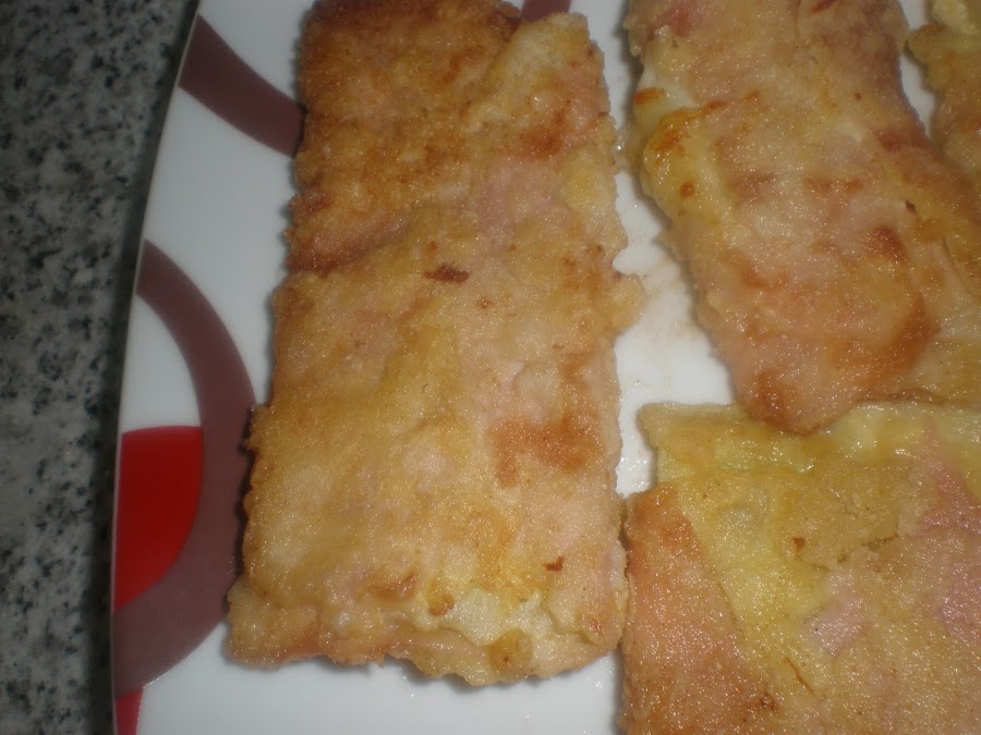 5º - En una sartén con bastante aceite , doramos los bocaditos que previamente habremos pasado por huevo y pan rallado , salamos y servimos .