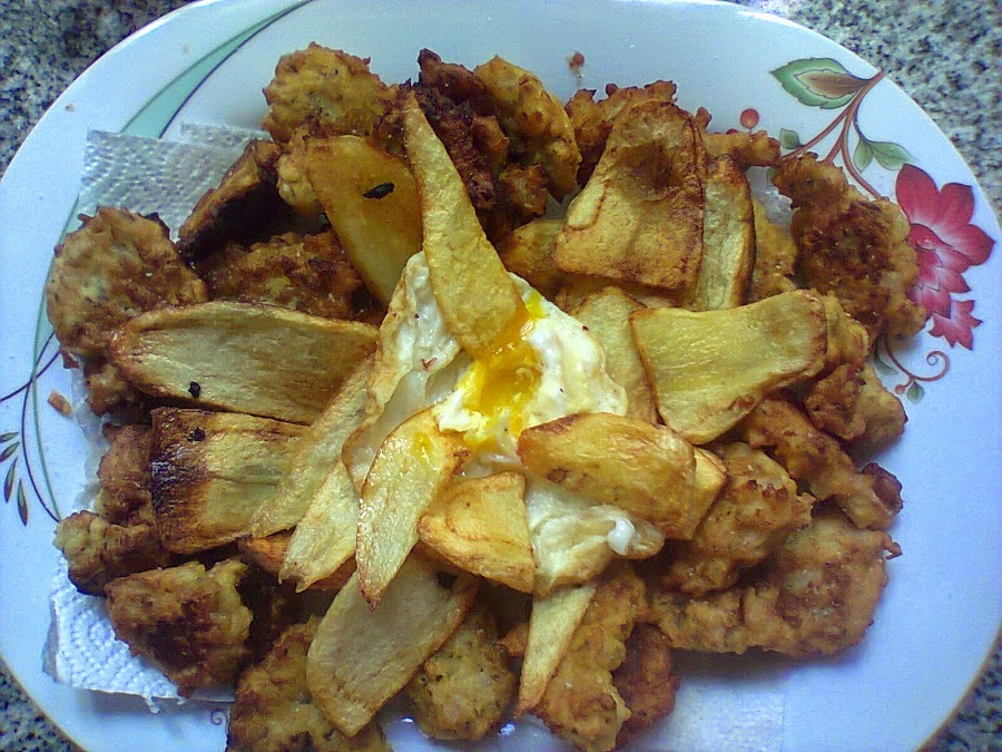 como toque final un huevo frito pero que quede bien cocida la clara pero no la yema...ponerlo en el centro y encima las papitas fritas para mojar en el huevo....