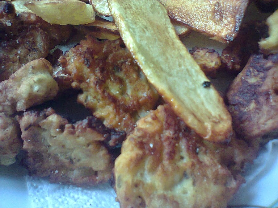 vamos poniendo en una fuente y mientras se cocinan preparamos unas papas como para acompañar...pelamos y cortamos finitas y a lo largo...freimos y colocamos por encima de los bocaditos