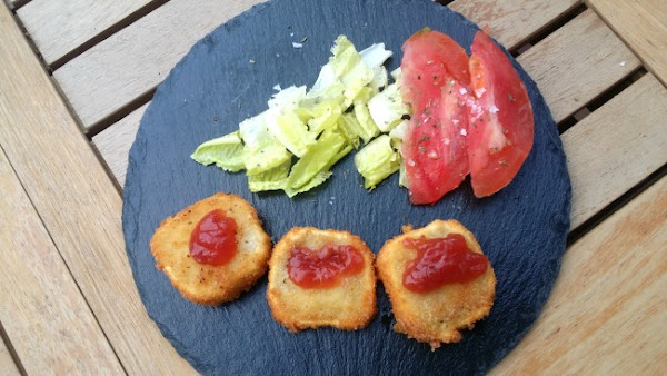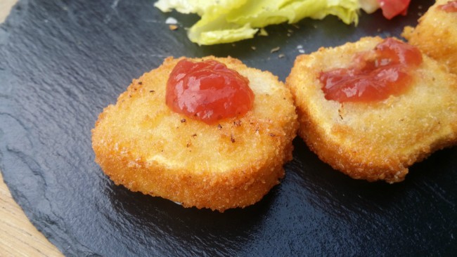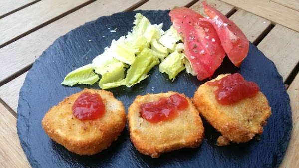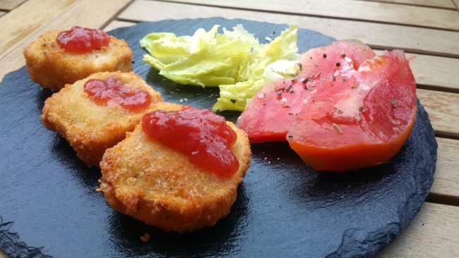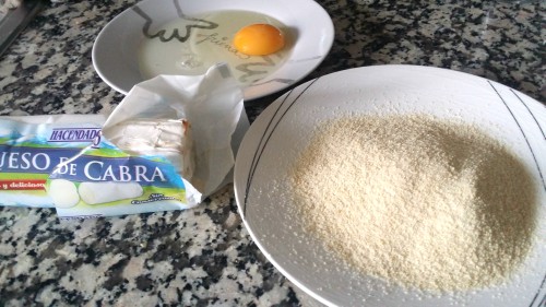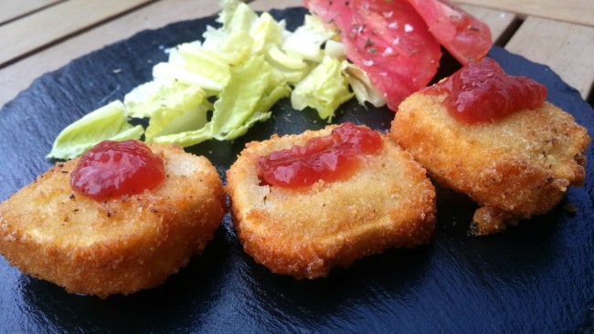 Hago habitualmente un rebozado de una cuña de queso brie con mermelada (de fresa, de pimiento, lo que veas...) que queda fantástica. Pero en este caso se trata de queso de cabra.