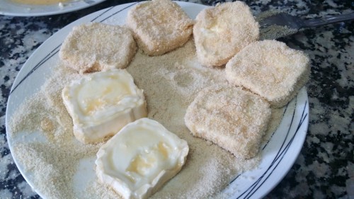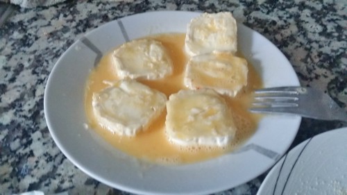 - Rebozamos los discos de queso primero en huevo