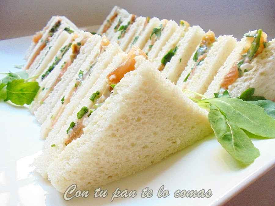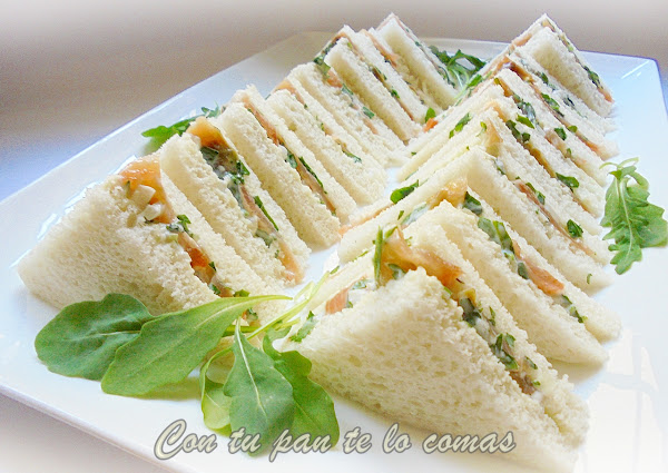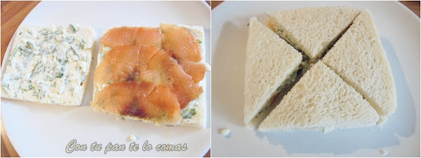 3 Unta dos rebanadas de pan de molde con la mezcla anterior y pon salmón ahumado en buena cantidad. Cierra el sandwich y corta en cuatro en diagonal.