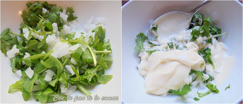 1. Con la salsa, que es muy fácil, untaremos las rebanadas de pan de molde para hacer los bocaditos. Mezclamos la cebolleta picada con un buen puñado de rúcula (se puede dejar entera o picarla también) y unas cucharadas de mayonesa.