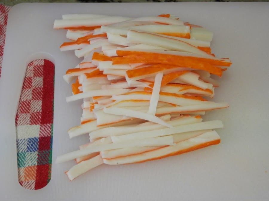 Picamos los palitos de cangrejo y los huevos.