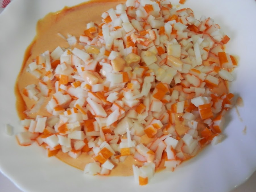 A la mezcla anterior, añadiremos el cangrejo y los huevos.