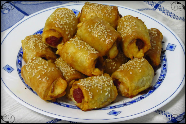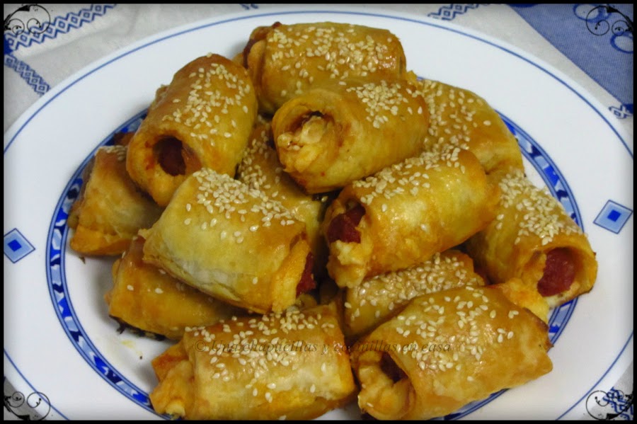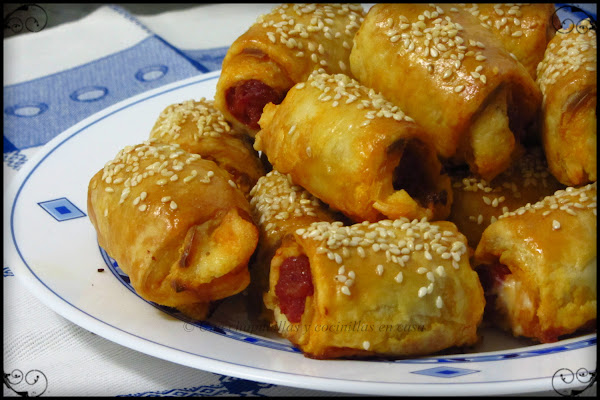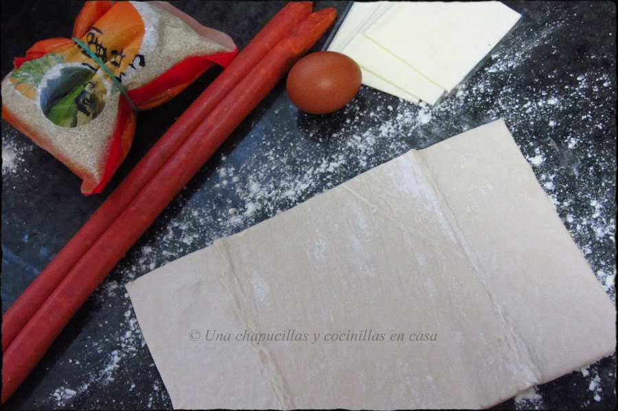 Esta receta es muy parecida a la de las trencitas de hojaldre de queso y chorizo, ahora es con txistorra y queso y mas fácil de hacer aun, solamente enrollar la txistorra con las lonchas y cortarla en trozos.