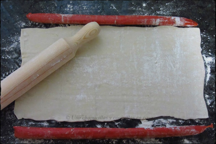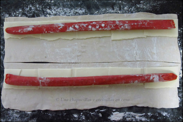 Estirar el hojaldre con ayuda del rodillo hasta lograr la largura de la sarta. Dividir la sarta en dos.