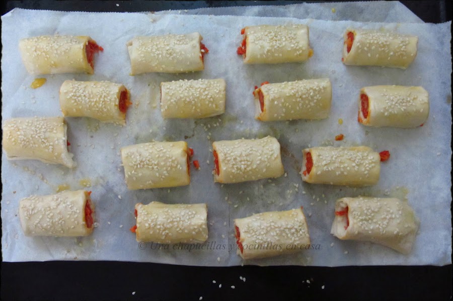 Poner sobre papel de horno en una bandeja y pintar con huevo batido con ayuda de un pincel. A continuación espolvorear las semillas de sésamo.