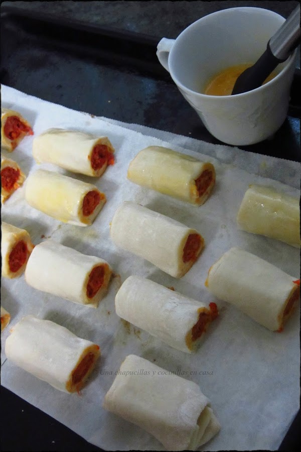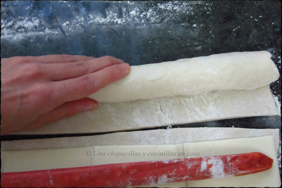 Enrollarlo todo, si no se os pega el hojaldre, darle un poco con agua en el borde y sellarlo.