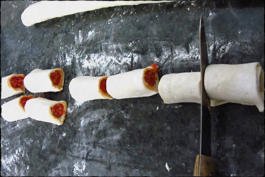 Dividir con un cuchillo cada rulo a la mitad, luego esa mitad en otra y luego en otra mas, en total 8 trozos.