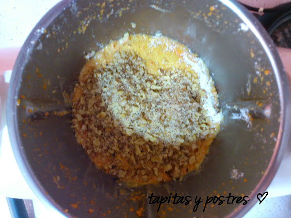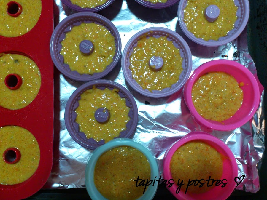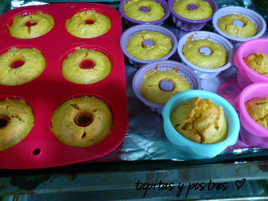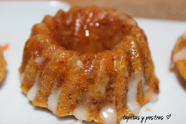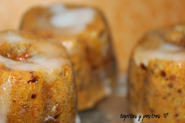 He elegido una versión mini de la carrot cake, con un glaseado de naranja. Es un bizcochito muy suave y jugoso con ligero toques crujientes de las nueces. Saqué la receta del blog cocinar sin miedo