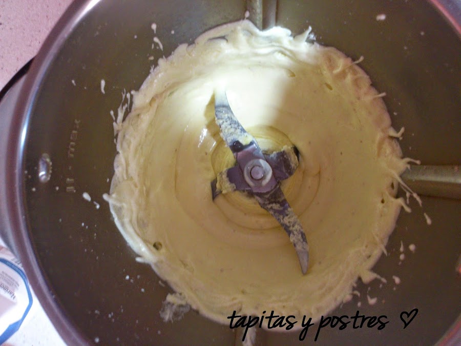 Ponemos la mantequilla y el azúcar en el vaso y lo mezclamos 30 segundos a velocidad 3. Tiene que quedarnos una mezcla cremosa.
