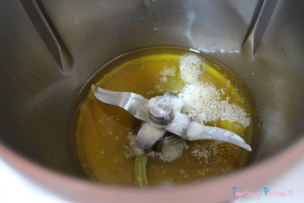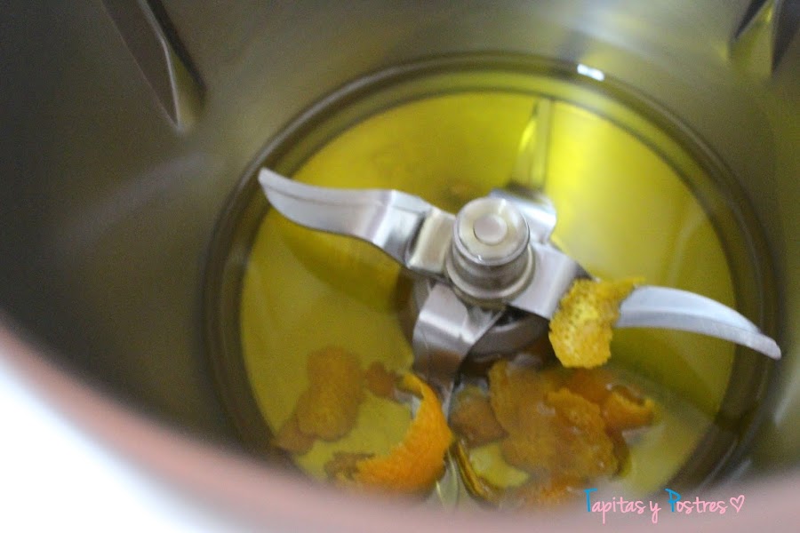 Ponemos el aceite con la piel de naranja en el vaso y calentamos diez minutos, varoma, velocidad 1. Dejamos el vaso fuera de la maquina para que se enfrie el aceite. Con cuidado retiramos la piel de naranja.