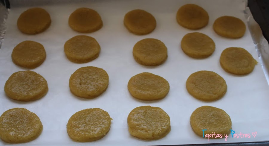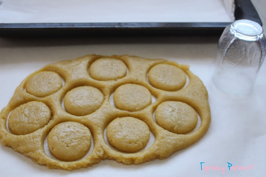 Con un cortapasta o vaso pequeño cortamos los bocaditos. La masa sobrante la unimos y estiramos para volver a sacar mas pastas, hasta que se acabe.