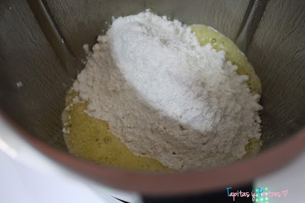 Añadimos la harina y el azúcar (solo los 30 gr) y amasamos 1 minuto a velocidad espiga.