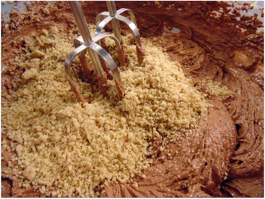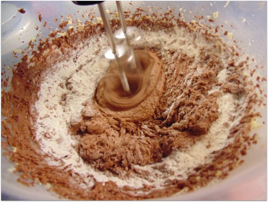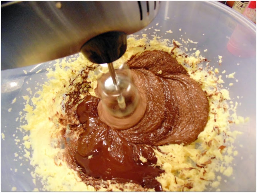 Posteriormente, vertemos el chocolate fundido al baño maría y añadimos poco a poco la harina y levadura previamente tamizadas.