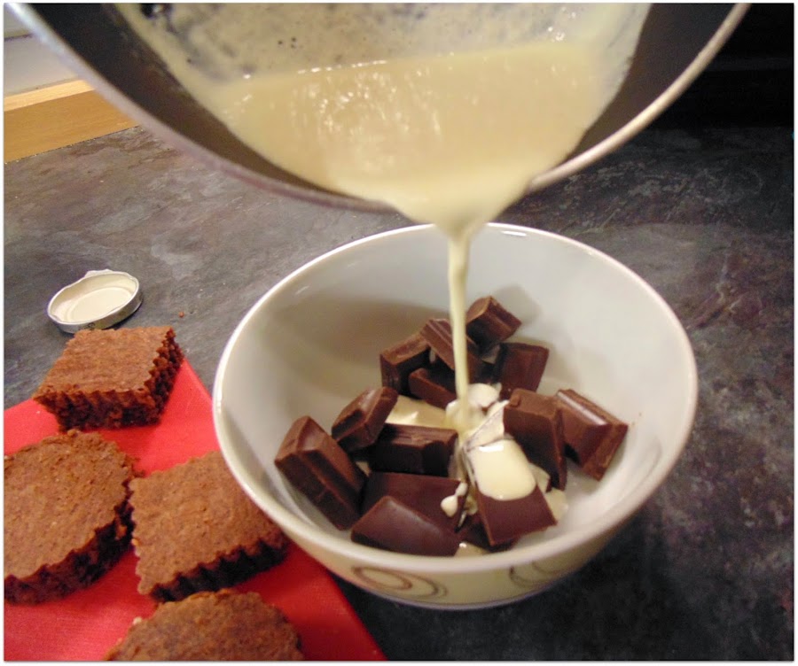 Para la cobertura calentamos la nata (crema de leche) al fuego y cuando esté a punto de hervir, vertemos sobre el chocolate troceado en un cuenco. Templamos y... ¡Listo para cubrir nuestros bocaditos!