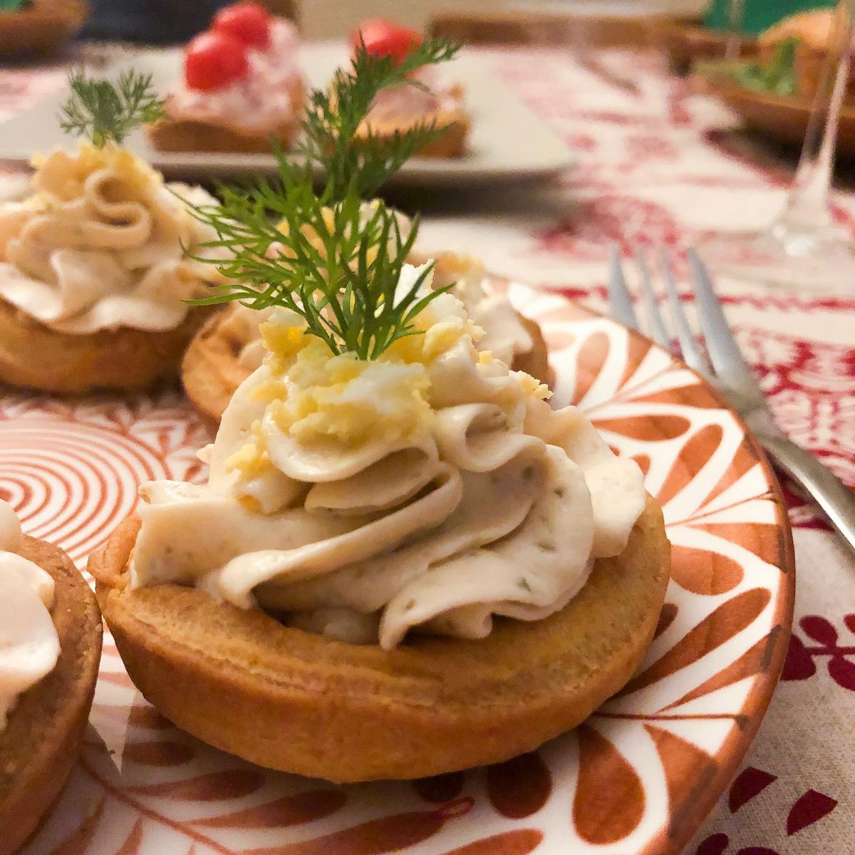 Solo queda preparar 3 mangas para poder servir encima de las bases, adornamos con nueces en caso de espinacas, un poquito de eneldo con el salmón y un tomatito cherry para el jamón cocido.
