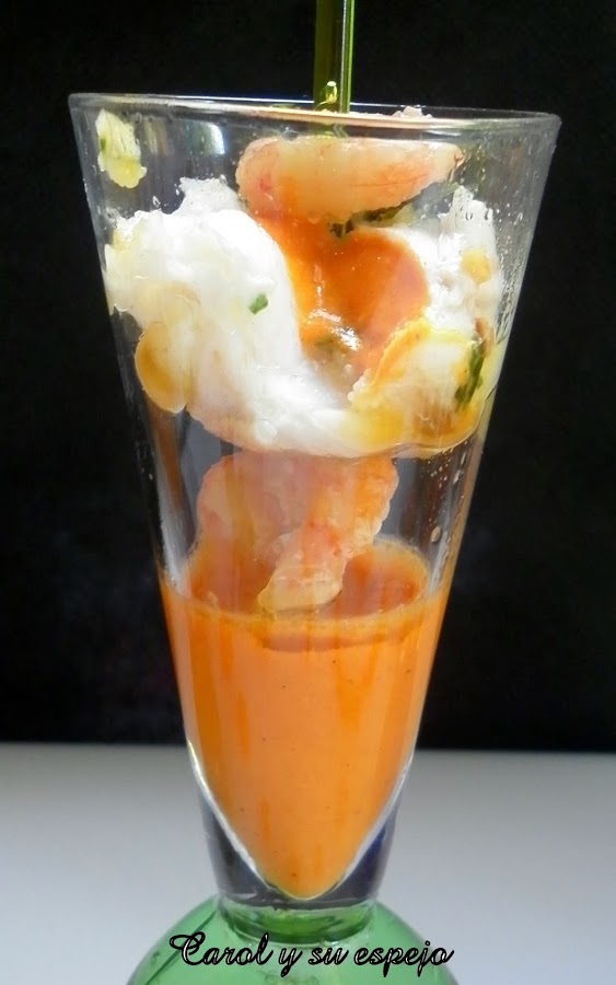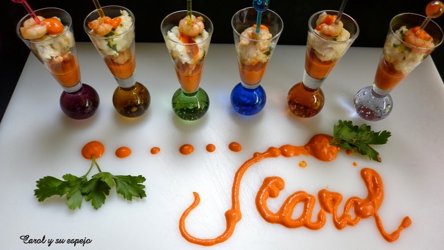 Montamos los vasitos, primero ponemos la salsa de pimientos y luego con un palillo ensartamos una gamba, un trozo de merluza y otra gamba al final , ¡¡¡muy importante!!! ¡¡¡¡hay que servirlo templado!!!!!! y .... A COMER!!!!!! Y A DISFRUTAR!!!!!