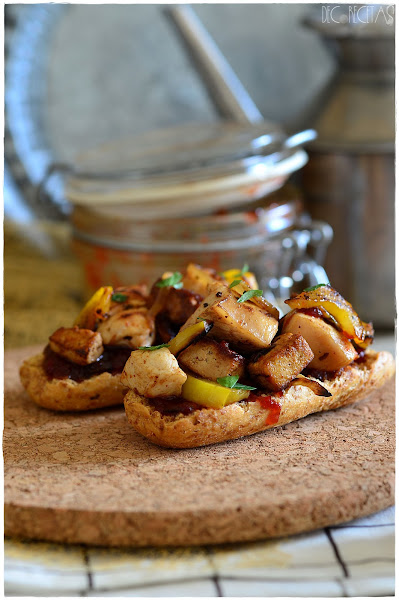 Con este pollo y tofu sobrante simplemente lo que hice fue depositarlos en unas rebanadas de pan salteados con pimiento amarillo, encima de mermelada de pimientos cuya receta tenéis aquí, y culminar con unas hojitas de perejil fresco