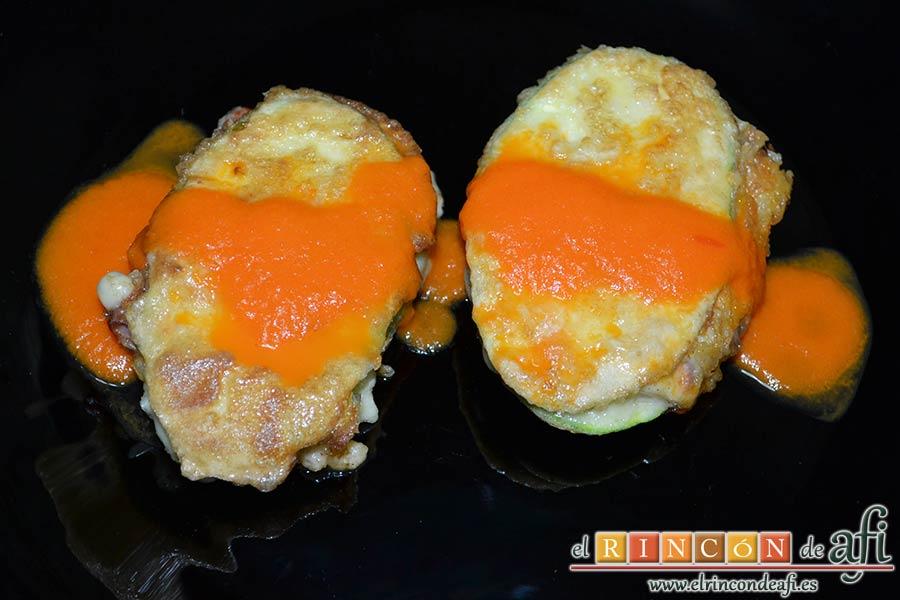 Estos ricos bocados de calabacín, jamón y queso con salsa casera de pimiento están listos para comer poniéndoles por encima la salsa que dejamos reservada. ¡A disfrutar!