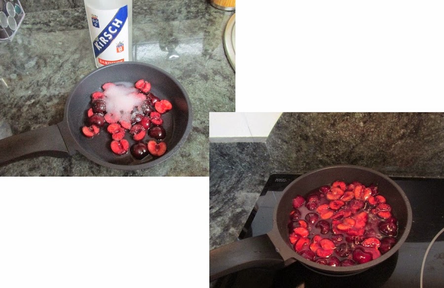 Ponemos en una sartén, las cerezas sin hueso y partidas por la mitad, con el azúcar y el kirsch.