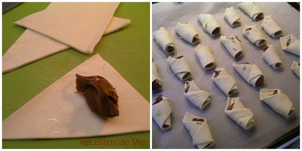 Tan fácil como parece. Solo tenéis que extender la lámina de hojaldre y cortarla en triangulos. Poner en cada triangulo una cucharadita de postres de la crema de chocolate. Doblar como veis en la foto.