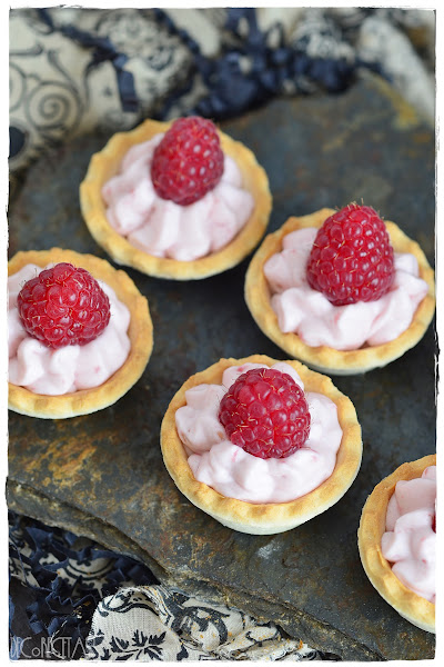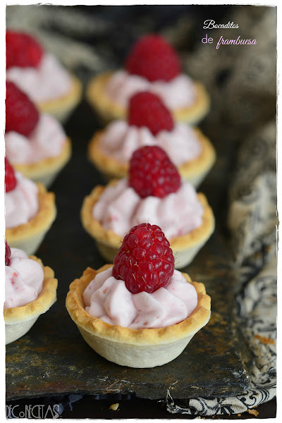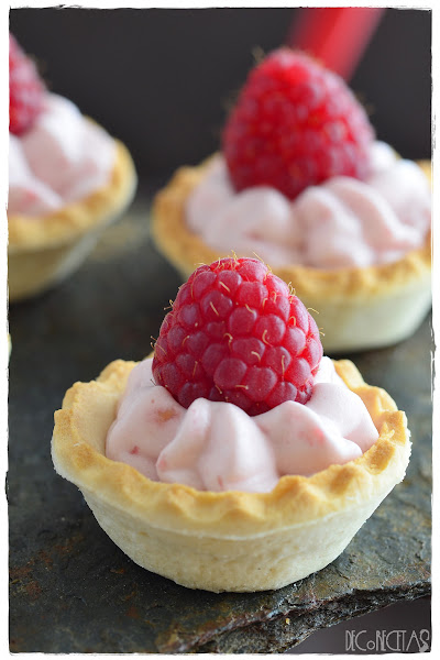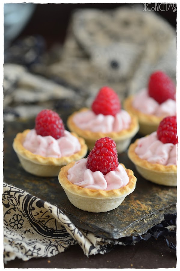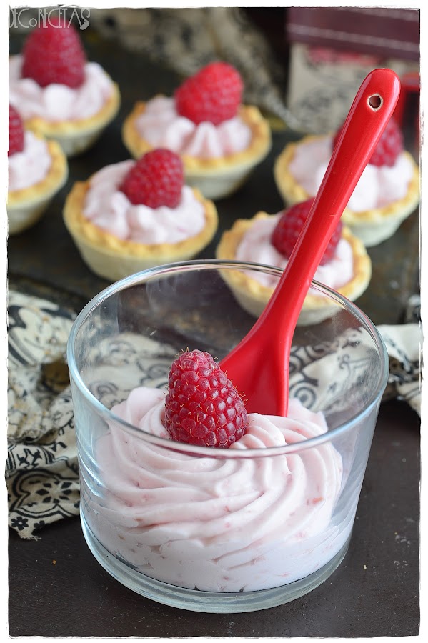 Para realizar la receta trituré 100 gramos de frambuesas con una trituradora ia esta mezcla añadir 3 sobres de gelatina en láminas previamente hidratada y templada 10 segundos en el microondas. Monte 200 gramos de nata montada (crema de leche) Con 50gr de azúcar glass y mezcle con la con el puré de frambuesas anterior con movimientos envolventes y con ayuda de una espátula.Rellene una manga pastelera y Juli rellenando las tartaletas y los vasitos con mando con una frambuesa fresca por encima