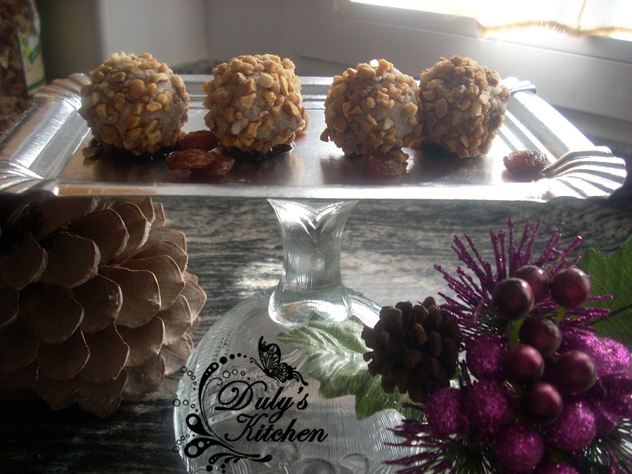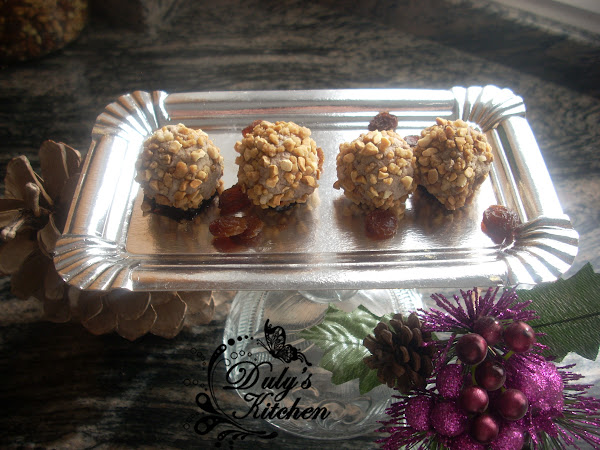 3. Con una cuchara cogemos una bola de paté, aplastamos una pasa en el centro y le damos forma con las manos.
