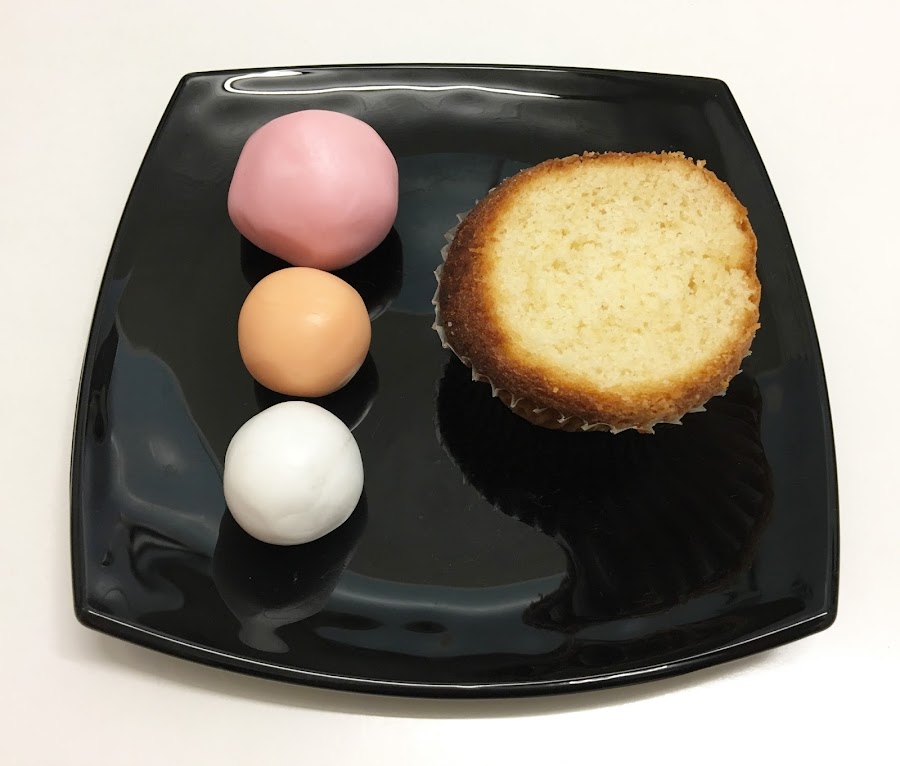 - Divide cada paquete de fondant en 6 partes iguales y haz bolas con cada uno, de forma que para cada cupcake tengas 3 bolas (1 blanca y dos rosas).