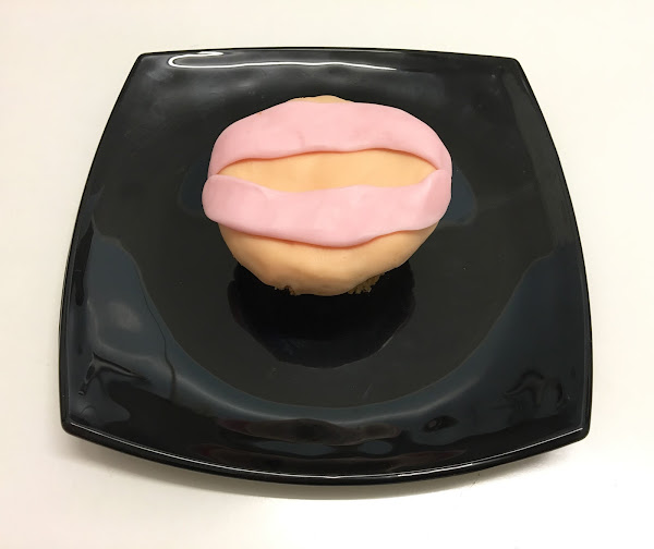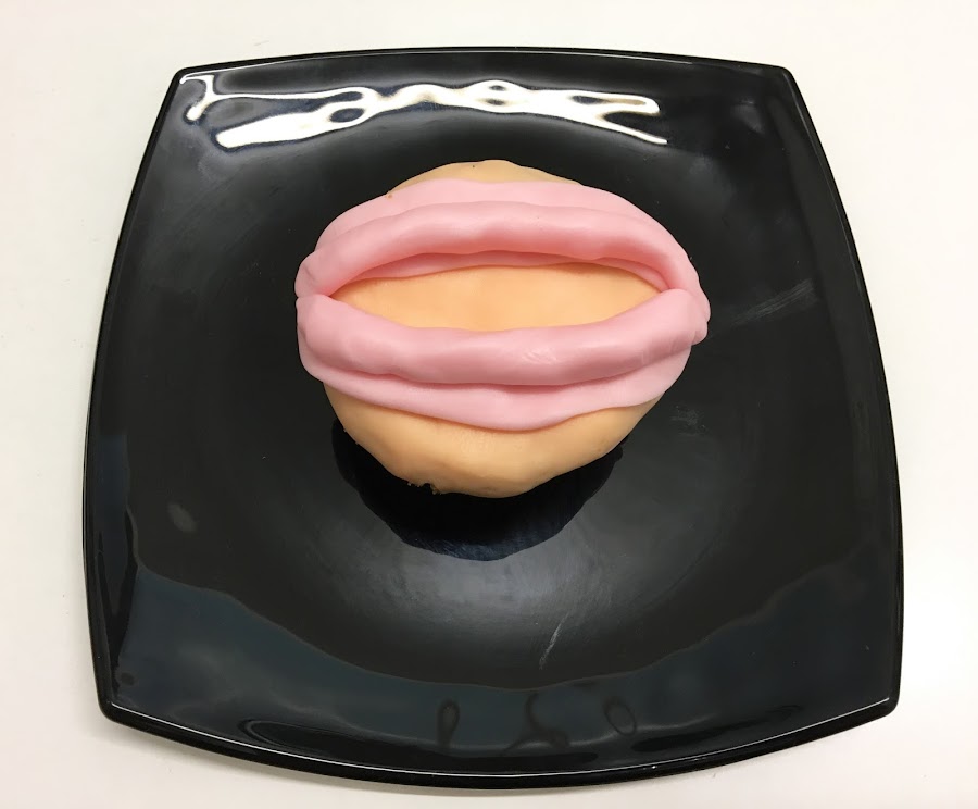 - Estira una parte rosa, aplástala suavemente con tus dedos para que quede liso y dale forma de media luna para formar la base de la encía superior.