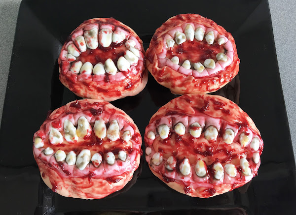 - Con un pincel, ve aplicando este color sobre las encías para que parezca sangre.
