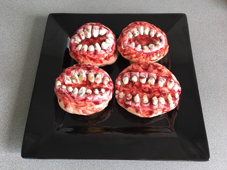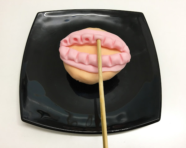 - Estira el resto de fondant naranja que habíamos reservado y divídelo en tiras. - Colócalo sobre la base de las encías de forma irregular para que parezcan tiras de piel de un zombie, fijándolo de nuevo con un pincel con agua.