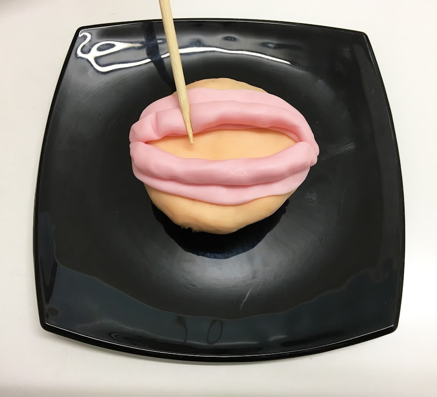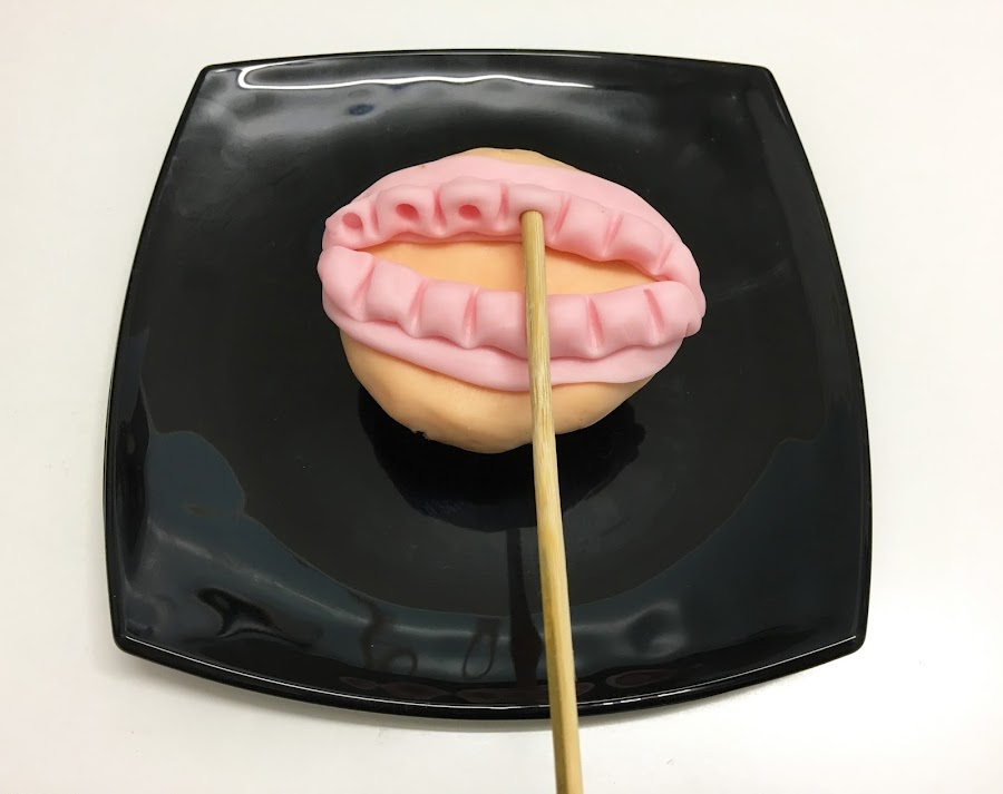 - Con la parte puntiaguda de un palito para brocheta o palillo grueso, comienza a dividir las encías en varios apartados, donde irán los dientes.