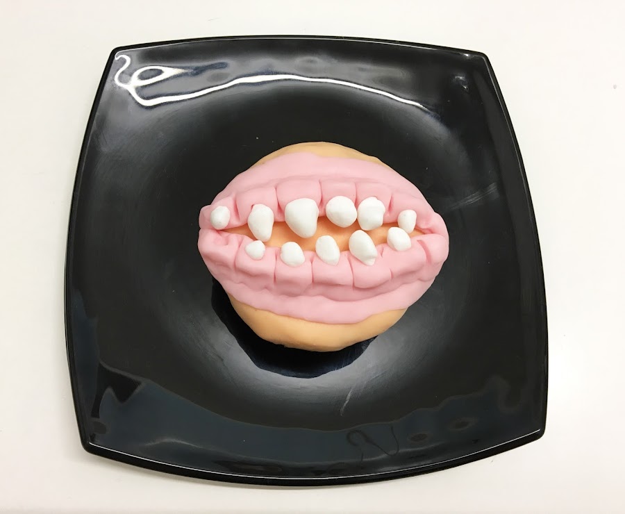 - Comienza a formar los dientes con el fondant blanco. Haz bolitas pequeñas del tamaño de un grano de maíz, haciendo la raíz del diente para que sea más fácil introducirlo en las encías.
