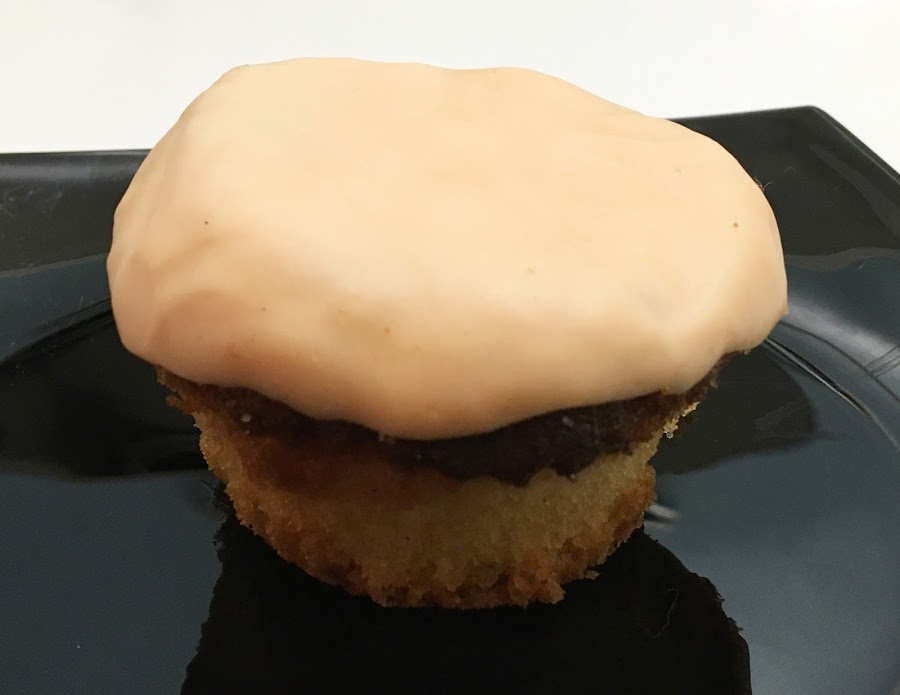 - Estira la bola anaranjada grande para darle una forma redondeada pero lisa y cubre la parte superior de cada magdalena. Ajústala en los bordes para envolverla bien.