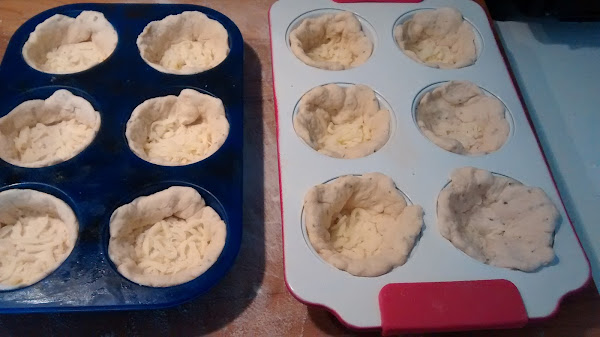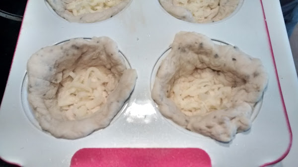 Engrasamos con aceite un moldes para cupcakes y colocamos la masa. En el culo de la masa colocamos un poco de queso rallado.