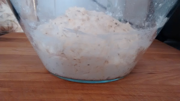 En un bol grande ponemos 300 gr de harina, en un vaso ponernos la pastilla de levadura con 200 gr de agua tibia. Echamos las especias secas y removemos todo. Una vez terminada dejamos la masa tapada durante una hora en un lugar cálido para que suba bien.