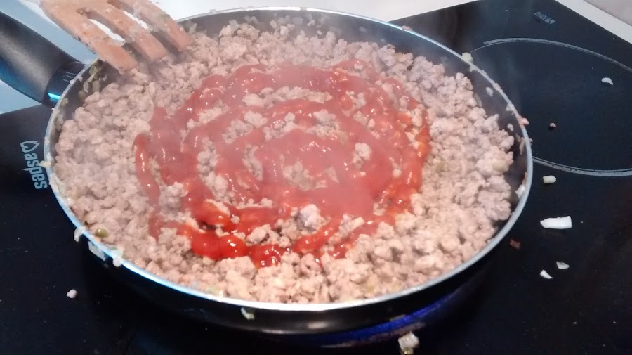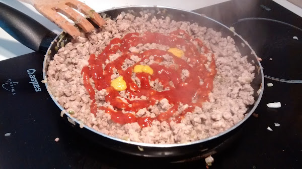 Rociamos con las especias y seguimos sofriendo. Cuando veamos que la carne esta a punto le echamos el ketchup y la mostaza(esto como siempre a gusto personal).