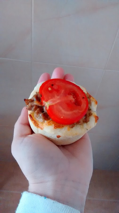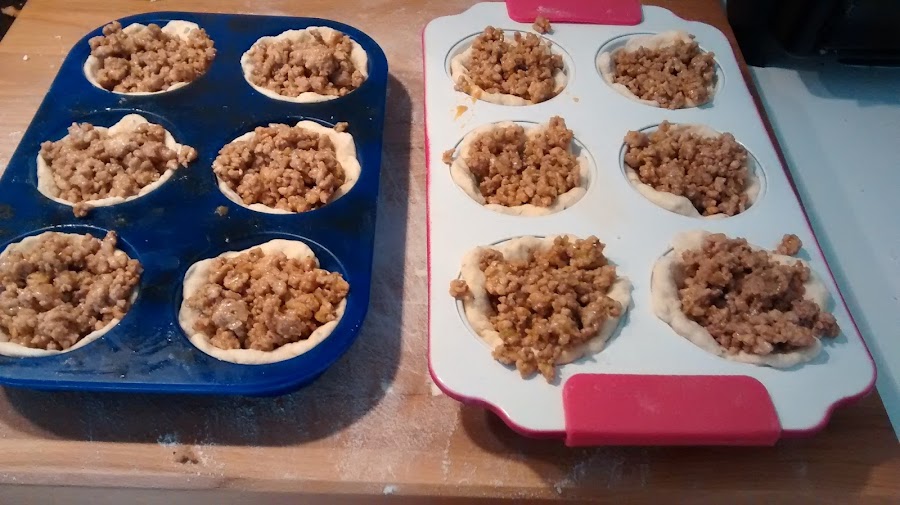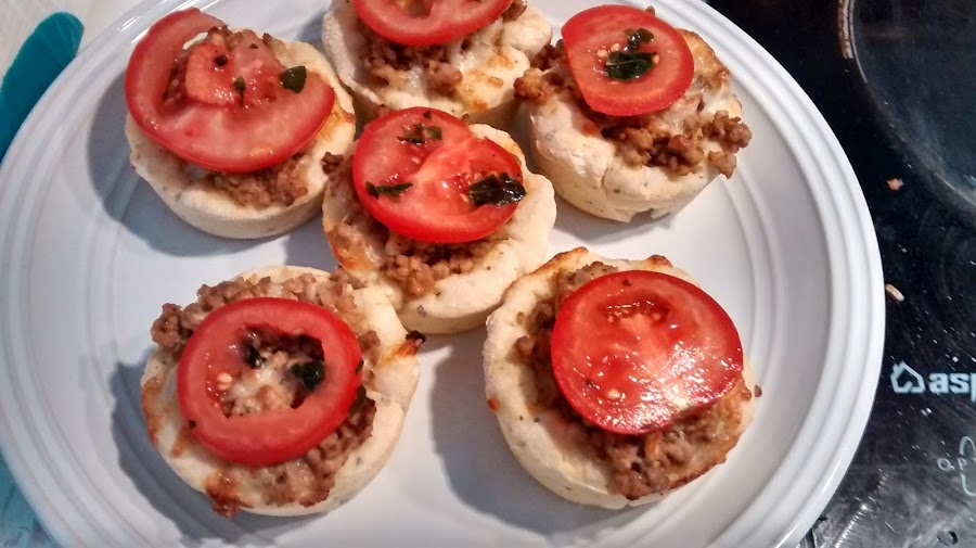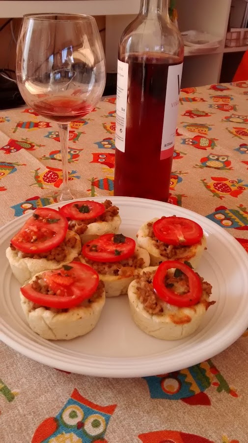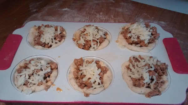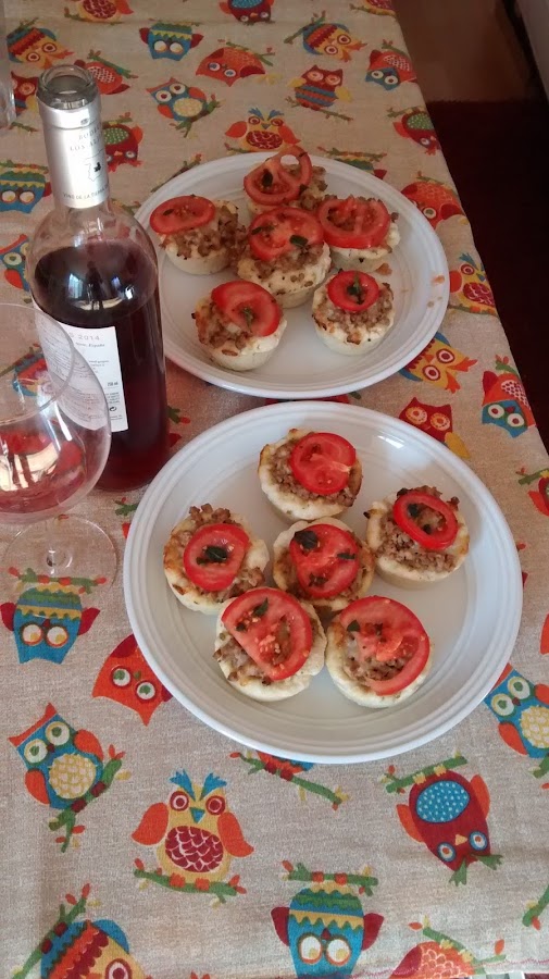 Rellenos la masa con la carne y lo cubrimos con un poco de queso, lo llevamos al horno que lo tenemos precalentando 180º durante 10 min cada bandeja (depende del horno como el mio es pequeñito solo puede meter una bandejita).