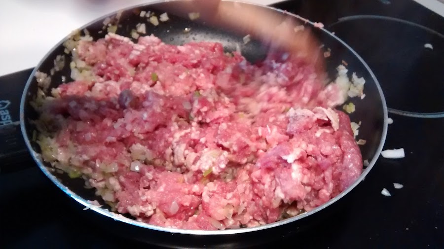 Picamos bien el cebollino y ponemos a sofreír junto con la carne picada.