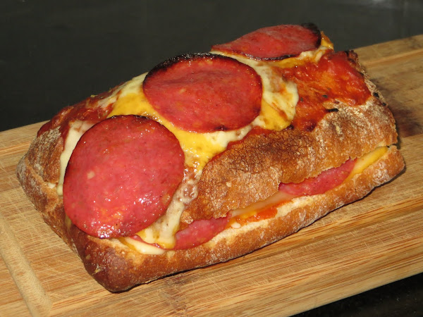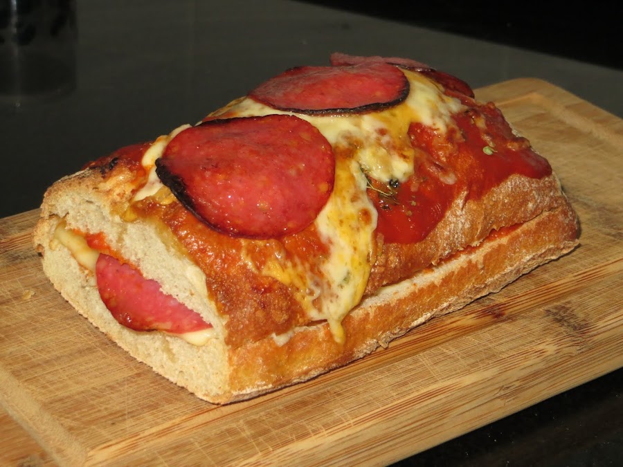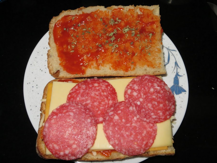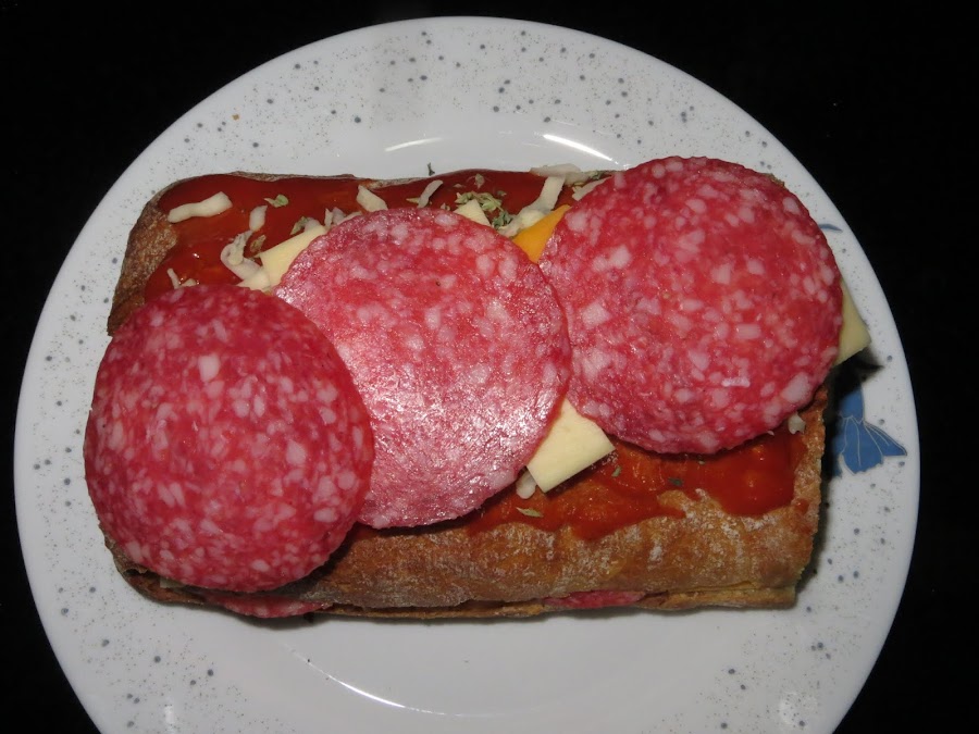 Tapamos el bocadillo y en su parte superior echamos un poco más de tomate frito, el queso rallado y trozos de queso cheddar y lonchas de salami y lo metemos al horno durante cinco minutos a gratinar o hasta que el queso esté fundido. Sacamos y ya está listo para comer.